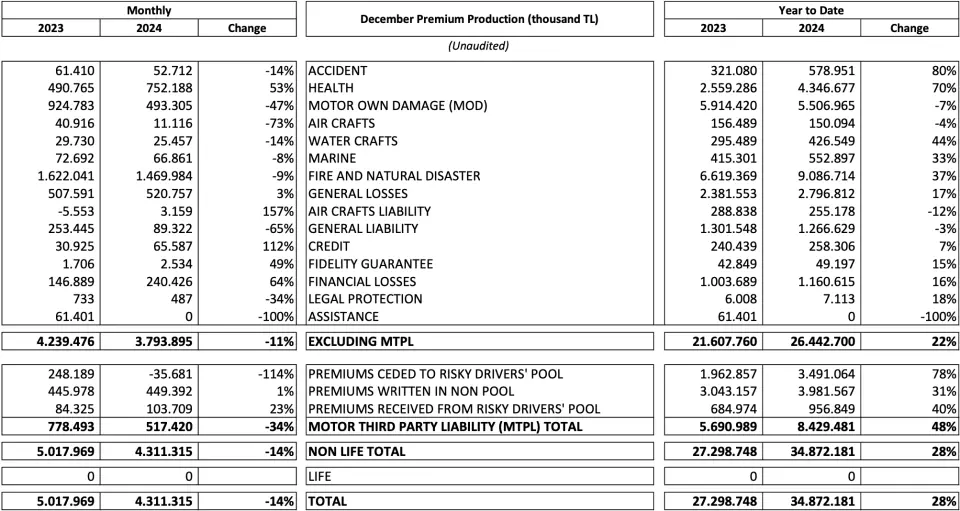"Aksigorta (AKGRT) tarafından aylık prim üretim verileri açıklandı. Buna göre, Şirket’in, Ocak-Aralık dönemindeki toplam brüt prim üretim rakamı 34.872.181.000 TL seviyesinde gerçekleşti. Aralık ayı rakamı ise 4.311.315.000 TL oldu. Bir önceki aya göre değişim %83 yıllık değişim ise %-14 seviyelerini işaret ederken, Ocak- Aralık 2024 dönemindeki toplam rakamın bir önceki yıla kıyasla değişimi ise %28 düzeyinde olmuştur."