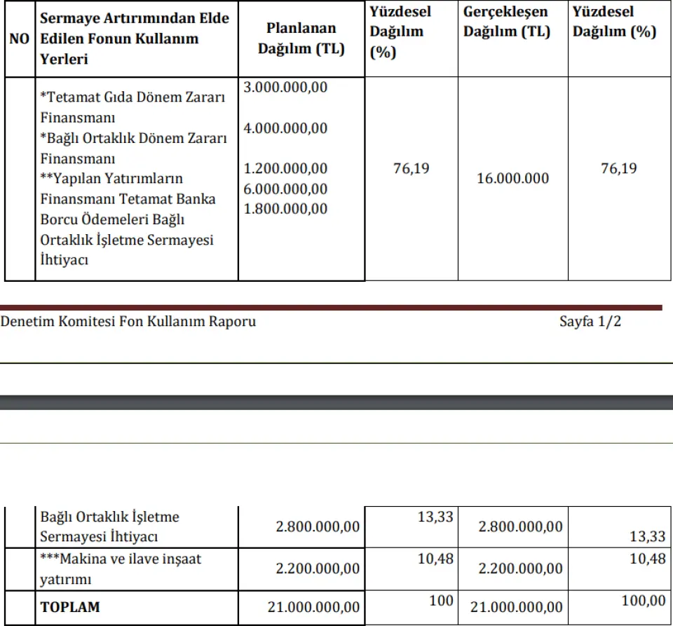 Sermaye Artırımından Elde Edilen Fon: Tetamat Gıda Yatırımları AŞ Yönetim Kurulu'nun
