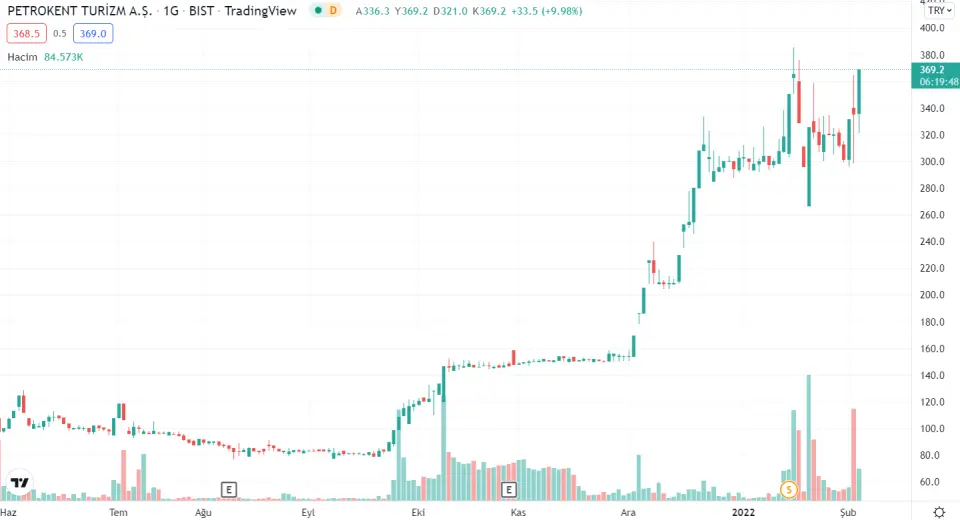 Petrokent 2022 yılında da karlılık düzeyini artırmaya devam ediyor. Şirketin hissesi Borsa İstanbul'da %9,98 yükselişle 369,20 TL'den işlem görüyor.