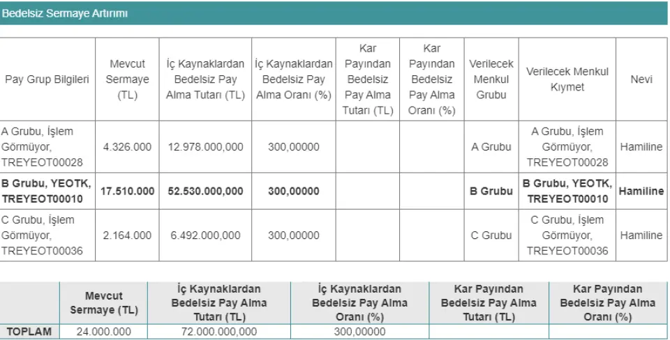 Şirketin 24.000.000 TL olan çıkarılmış sermayesinin, 100.000.000 TL kayıtlı sermaye tavanı içerisinde kalacak şekilde, tamamı iç kaynaklardan (59.187.816,17 TL emisyon primlerinden, 12.812.183,83 TL geçmiş yıllar karlarından) karşılanmak suretiyle 72.000.000 TL tutarında (%300 oranında) arttırılarak 96.000.000 TL'ye çıkarılmasına ve iç kaynaklardan bedelsiz sermaye artırımı yapılmasına, Sermaye Piyasası Kurulu'na yapmış olduğumuz bedelsiz sermaye artırımı başvurumuzun bu kapsamda güncellenmesine karar verilmiştir.