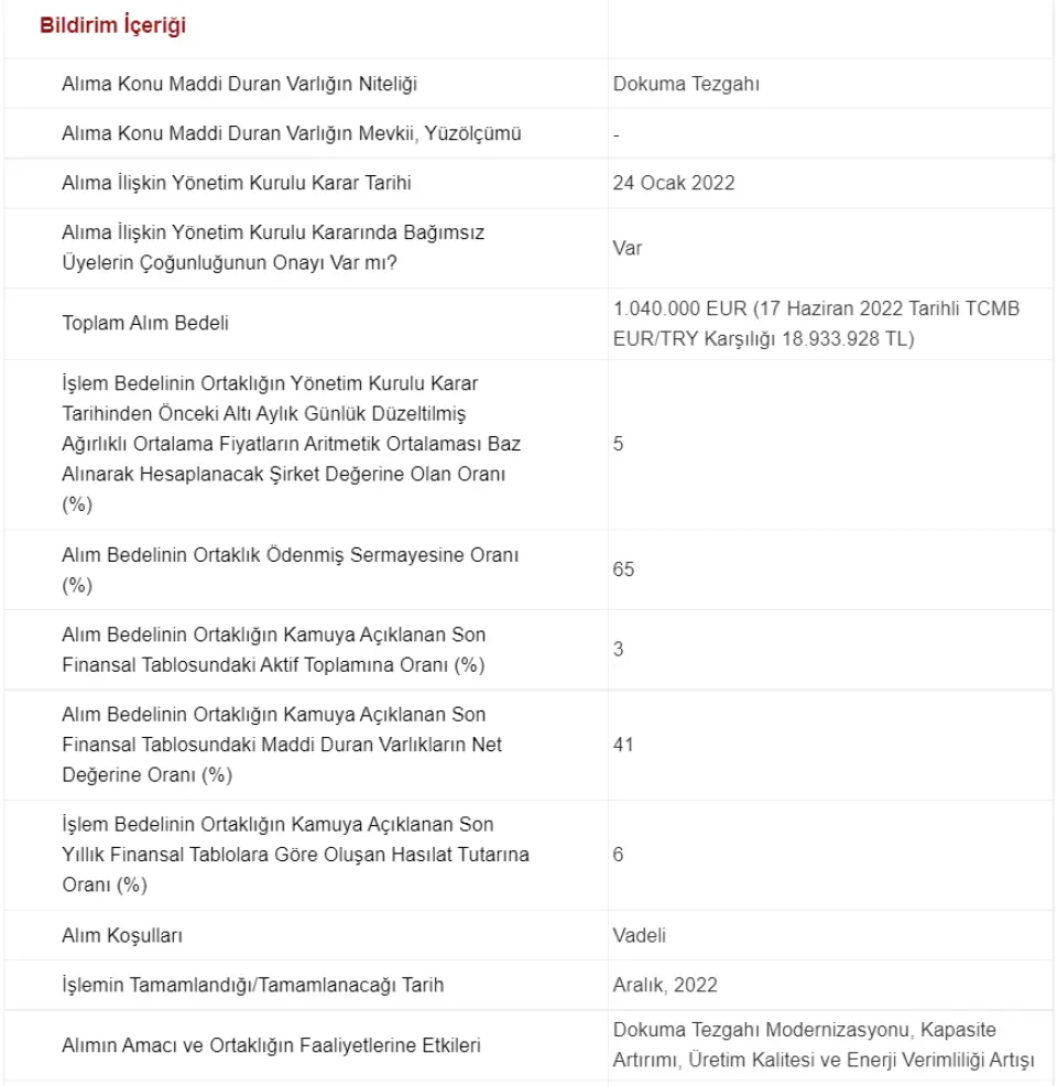 Şirketimizin 24 Ocak 2022 tarihli Yönetim Kurulu kararına istinaden başlatılan planlı yatırım çalışmaları sonucu dokuma tezgahı kapasite artırımı ve modernizasyon yatırımı için üretici firma ile anlaşma sağlanmıştır.