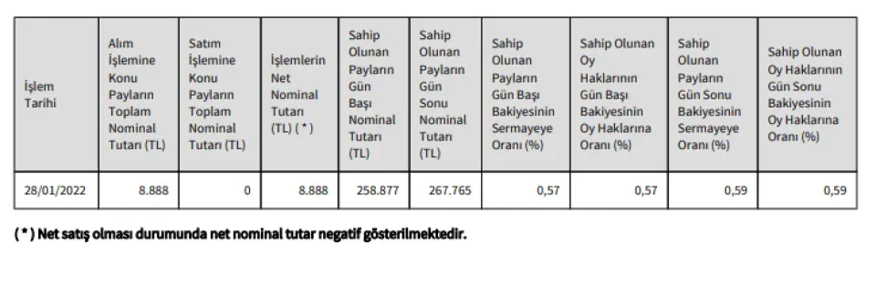 28/01/2022 - 28/01/2022 tarihinde E-DATA TEKNOLOJİ PAZARLAMA A.Ş. payları ile ilgili olarak 25,54 - 25,54 TL fiyat aralığından 8.888 TL toplam nominal tutarlı alış işlemi ve/veya 0 TL toplam nominal tutarlı satış işlemi tarafımca/ortaklığımızca gerçekleştirilmiştir. Bu işlemle birlikte E-DATA TEKNOLOJİ PAZARLAMA A.Ş. sermayesindeki paylarım/oy haklarım 28/01/2022 tarihi itibariyle %0,59 sınırına ulaşmıştır/aşmıştır/altına düşmüştür. İşlemin detaylarına ilişkin bilgiler aşağıdaki tabloda yer almaktadır.