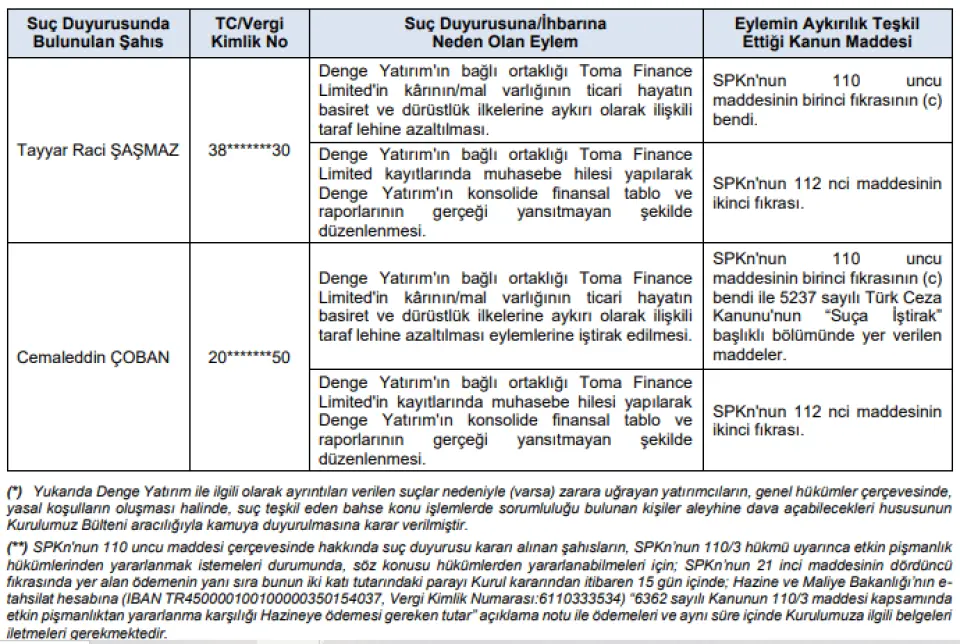 SPK tarafından yayınlanan haftalık bültende Denge Yatırım Holding hesap işlemlerinde yapılan usulsüzlük nedeniyle SPK 2 kişi hakkında suç duyurusunda bulundu