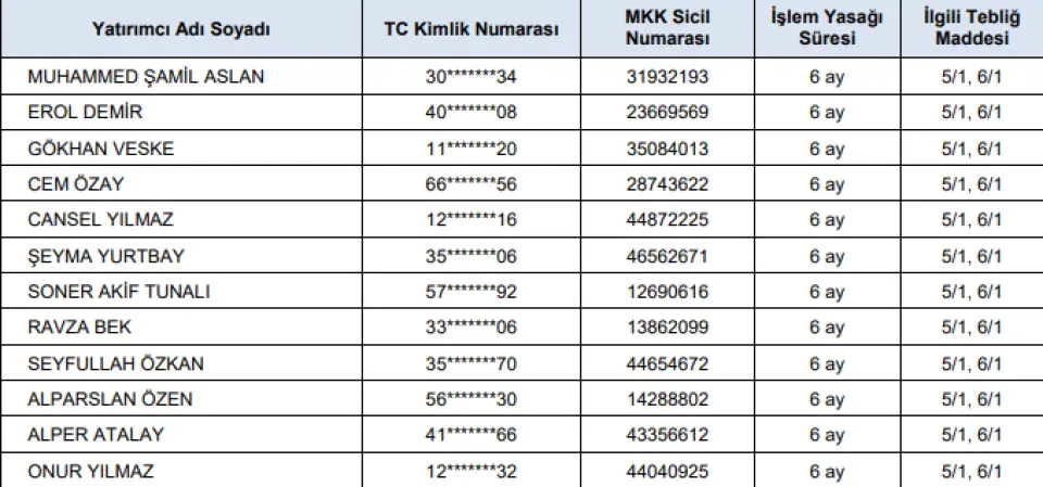 tabloda bilgilerine yer verilen kişiler hakkında 21.02.2022 tarihli işlemlerden başlamak üzere borsalarda 6 ay süreyle geçici işlem yasağı uygulanmasına karar verilmiştir.