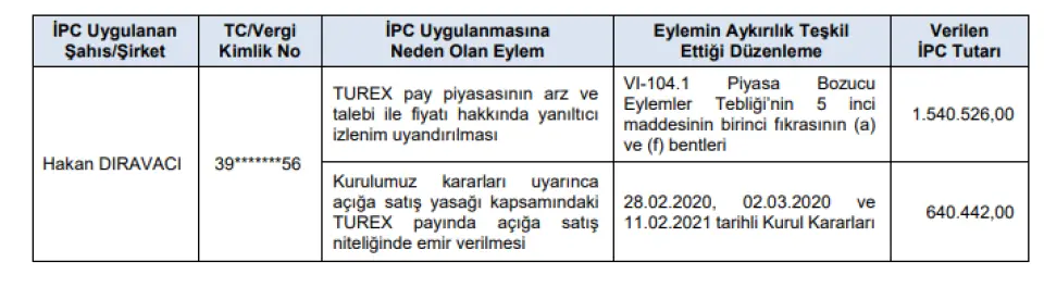 Kurul ayrıca, Hakan Dıravacı‘ya da TUREX’teki usulsüz işlemleri sebebiyle 6 ay işlem yasağı getirmişti.