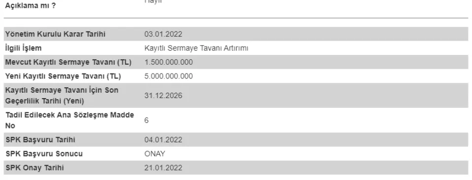 Kayıtlı sermaye sistemi içerisinde bulunan şirketimizin, mevcut 1.500.000.000 TL tutarındaki kayıtlı sermaye tavanının 5.000.000.000 TL'na yükseltilmesine ve Şirketimizin mevcut kayıtlı sermaye tavanı geçerlilik süresinin de bu kapsamda 2022-2026 yıllarını kapsayacak şekilde güncellenmesi konusunda şirket esas sözleşmesinin "Şirketin Sermayesi" başlıklı 6.maddesinin tadil edilmesine ilişkin Sermaye Piyasası Kurulu'na yapmış olduğumuz başvurumuz, Kurul'un 21.01.2022 tarih ve E-29833736-110.04.04-16163 sayılı yazısı ile ekli şekilde onaylanmıştır.