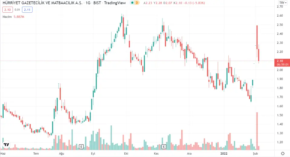 Hisse Borsa İstanbul'da %5,38 düşüş ile 2.10 TL'den işlem görüyor.