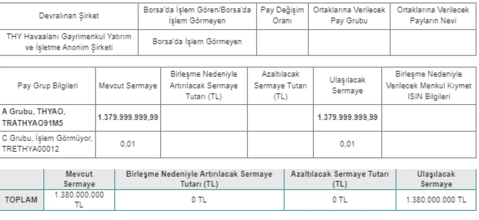 Ortaklığımızın %100 hissedarı olduğu THY Havaalanı Gayrimenkul Yatırım ve İşletme Anonim Şirketi ile Sermaye Piyasası Kurulu'nun II-23.2 sayılı Birleşme ve Bölünme Tebliği, 6102 sayılı Türk Ticaret Kanunu'nun 136-158 maddeleri ve 5520 sayılı Kurumlar Vergisi Kanunu'nun 18,19 ve 20. maddelerinde düzenlenen kolaylaştırılmış birleşme hükümleri uyarınca düzenlenen devralma suretiyle kolaylaştırılmış usulde birleşmesine onay verilmesi için 28.04.2022 tarihinde Sermaye Piyasası Kurulu'na başvuruda bulunulmuştur.