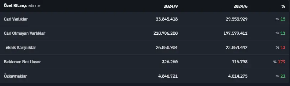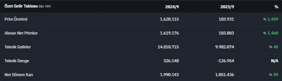 2024 yılının üçüncü çeyreğinde alınan net primler 1.619.176.000 TL olarak açıklanmıştır. 2023 yılının üçüncü çeyreğinde ise bu veri 103.803.000 TL idi. Alınan net primler 2024 yılının üçüncü çeyreğinde, 2023 yılının aynı dönemine oranla %1.460 arttı.