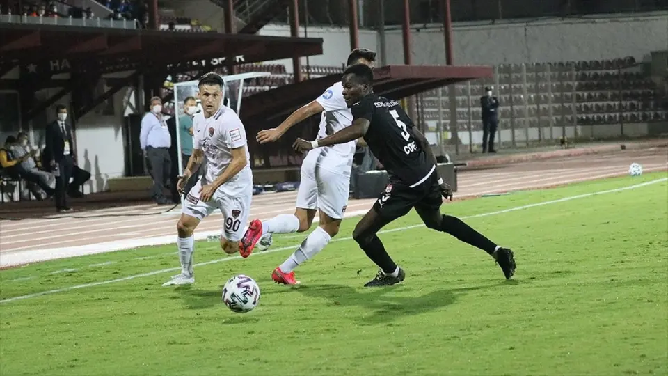 8. dakikada Hatayspor beraberliği yakaladı. Selim Ilgaz'ın sağ kanattan yerden yaptığı ortada kale önünde topun gelişine vuran Akintola, meşin yuvarlığı filelerle buluşturdu. 1-1