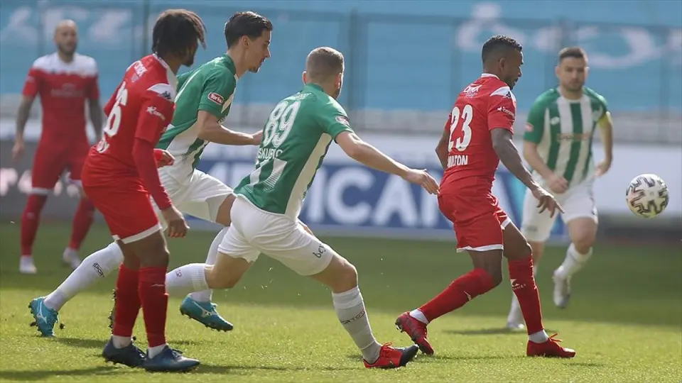 KONYA (AA) - 33. dakikada Ömer Ali Şahiner'in sağ kanattan kullandığı köşe vuruşuna iyi yükselen Jevtovic'in kafa vuruşunda, meşin yuvarlak az farkla yandan auta gitti.
