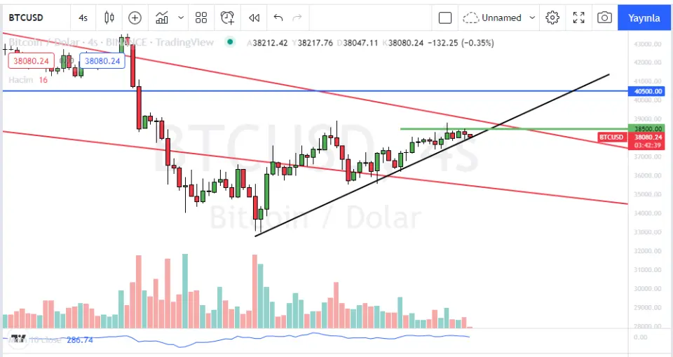 #Bitcoin düşen trendi kırmaya çalışıyor. Günlük grafikte 38500 üstünde gelecek kapanışlarda ayılar güç kaybetmeye başlayabilir. Boğaların hareketlenmesi 40500 üstünde kapanışlarda olabilir.4 saatlik grafikte bollinger bandı daralmaya başlamış. #BTC#BTCUSDT#BTCUSD