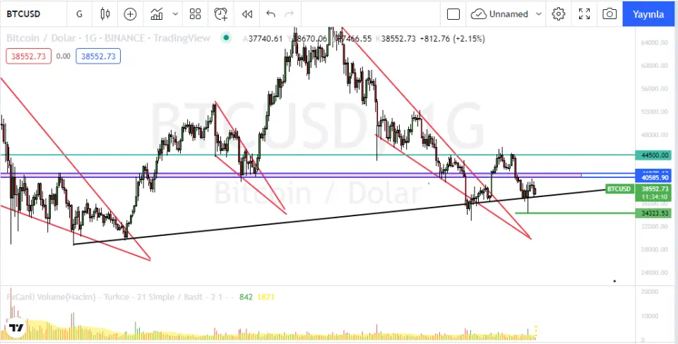 Bitcoin trend üstünde tutunmaya devam ediyor. 37300 altında günlük kapanışlarda 34300 test edebilir. 40500-41300 sıralı dirençler. Görüntü zayıf. 41300 üstünde günlük kapanışlarda boğalar hareketlenebilir. Önemli seviye 44500.#BTC #BTCUSD