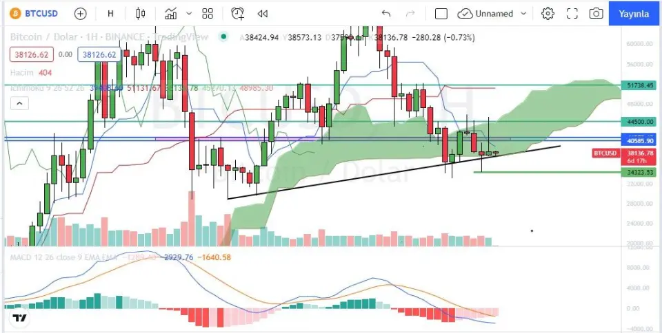 Haftalık grafikte trend çizgisinde ayı boğa savaşı halen devam ediyor. Macd sat konumunda. İchimoku bulutunun desteğinde. Altta 37300 üstte 40585 seviyeleri aktif.