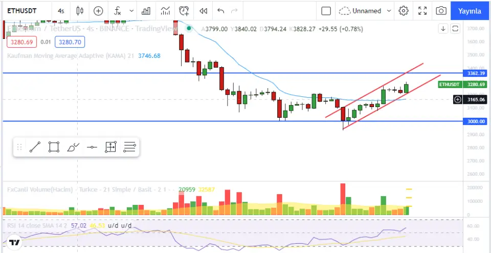 #Ethereum 4 saatlik grafikte, yükselen kanal içinde. Olumlu hareketler için 3350 seviyesi üstünde kapanış gelmesi lazım. Altta 3000 seviyesi destek konumunda. #ETH