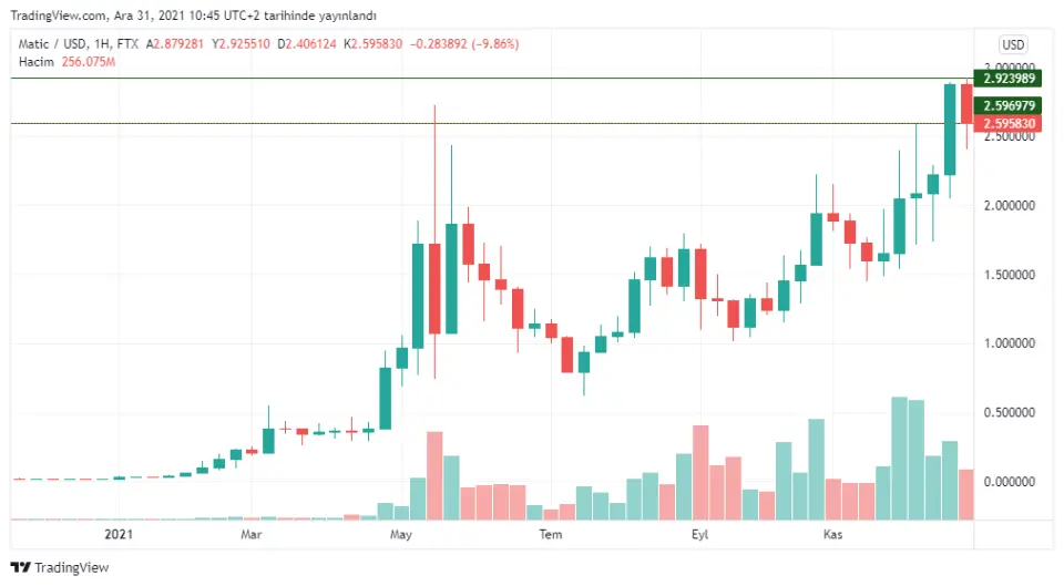 Bu trendde, 0,62 de dip yapan MATIC, oradan başladığı yükseliş trendini bu güne kadar sürdürebildi. Yılın son haftası yeni tarihi zirvesi olan 2,92 dolar gördü. Hala çıkış trendinde görünen MATIC azalan işlem hacmiyle , yeni yılda bir düzeltme yaşayacak gibi görünüyor."