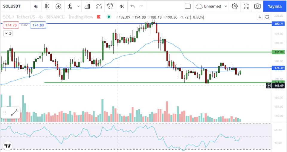 4 saatlik grafikte 176 seviyesinde satış gelen #solusdt 176 yı tekrardan test edebilir. Üstünde tutunursa 185 testi başlayabilir. Destek seviyeleri 168-155