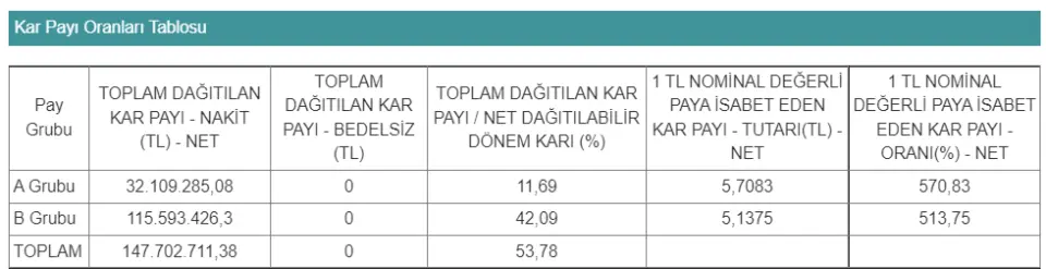 2021 yılı karından vergiler düşüldükten sonra kalan net dağıtılabilir dönem karından, ödenmiş sermayenin % 5'inin ortaklara I. Temettü (1.406.250,00 TL) olarak, bakiye karın % 5'inin intifa senedi sahiplerine, 1.750.000,00 TL'nin yönetim kurulu üyelerine, 159.140.175,42 TL'nin ortaklara II. Temettü olarak dağıtılmasına ve şirket esas sözleşmesine göre genel kanuni yedek akçe ayrılmasına, Böylelikle 2021 yılı için ortaklarımızın hukuki durumlarına bağlı olarak brüt % 570,83, net % 513,75 oranında toplam brüt 160.546.425,42 TL kar payının 21 Nisan 2022 tarihinde nakden ödenmesine oy birliği ile karar verildi.