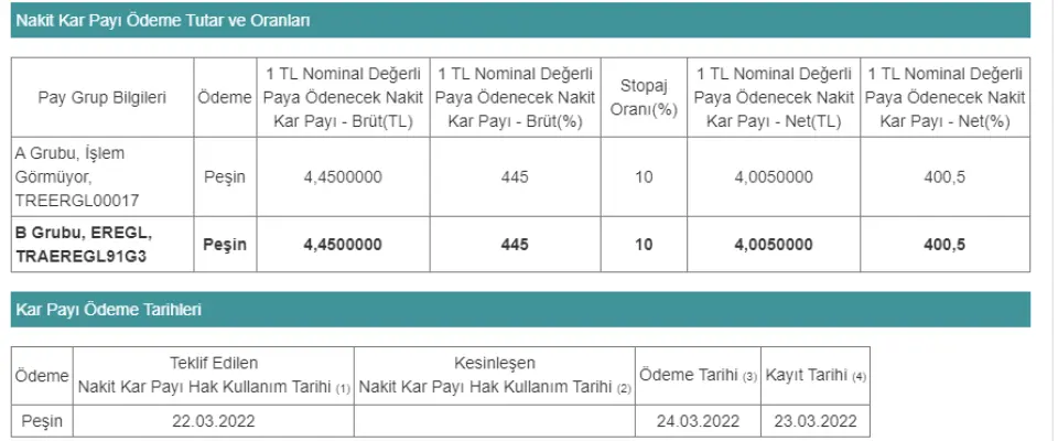 Ereğli Demir Çelik #EREGL KAP'a yaptığı açıklama ile kâr payı yani temettü tutarını açıkladı! 1 TL nominal paya 4 TL ödeme yapacak olan #EREGL %400 oranında dağıtım yapacak!