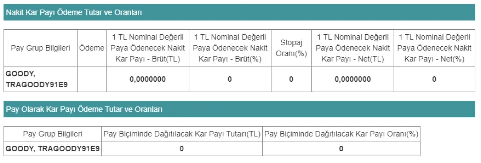Goodyear Lastikleri T.A.Ş.'nin 13.04.2022 tarihinde gerçekleştirilen Genel Kurul toplantısında; Goodyear Lastikleri T.A.Ş. Yönetim Kurulu'nun 14.03.2022 tarihli kararıyla; gerek içinde bulunduğumuz küresel ve ulusal ekonomik şartlar, gerekse işletme sermayesi yönetiminde sürdürdüğümüz ihtiyatlı yaklaşımımız doğrultusunda; 2021 yılı faaliyetleri sonucunda Sermaye Piyasası Kurulu ("SPK") düzenlemelerine göre oluşan 367.465.078,00 TL net dönem karından; 6102 sayılı Türk Ticaret Kanunu'nun 519/1 maddesinde öngörülen yasal kayıtlarda yer alan net dönem karının %5'i olan 11.916.433,19 TL'nin genel kanuni yedek akçe olarak ayrılmasının ve SPK'nın kar dağıtımına ilişkin düzenlemelerine uygun olarak, dağıtılabilir net dönem karından ortaklara kar payı dağıtılmaması önerisi oy çokluğuyla onaylanmıştır.
