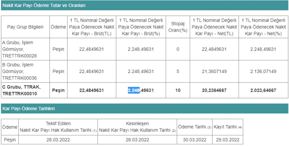 Türk Traktör #TTRAK, KAP'a yaptığı açıklama ile %2.248 oranında dev temettü dağıtımının onaylandığını duyurdu. Şirket tarafından yapılan açıklamanın detayları;