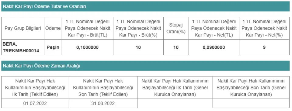 Türk Ticaret Kanunu (TTK) ve Vergi Usul Kanunu (VUK) hükümleri çerçevesinde düzenlenmiş yasal kayıtlar doğrultusunda hazırlanan mali tablolara göre 176.885.719,81 TL Dönem Net Karı oluşmuştur. Buna göre 2021 yılı hesap döneminde TMS/TFRS uyarınca hazırlanan konsolide mali tablolarda 746.546.258,00 TL, TTK ve VUK hükümleri uyarınca düzenlenen mali tablolarda ise 176.885.719,81 TL Dönem Net Karı oluşması nedeniyle, SPK'nın kar dağıtımına ilişkin düzenlemeleri kapsamında, Yönetim Kurulu'nun 15 Şubat 2022 tarihli toplantısında, Şirket kar dağıtım politikasına uygun olarak, Esas Sözleşmenin 16.maddesine istinaden, 2021 yılı toplam dağıtılabilir net dönem kârının Holding'in Çıkarılmış sermayesinin %10'una tekabül eden 34.160.000 TL'sinin Genel Kurul Toplantısının tescil edildiği ayı takip eden 2. ayın sonuna kadar nakden ödenmesi teklifinin Yönetim Kurulu tarafından 2021 Yılı Olağan Genel Kurulu'na sunulması kararlaştırılmıştır. Bu bağlamda, Yasal kayıtlara göre oluşan 84.396.102,86 TL Net dağıtılabilir dönem karından 17.080.000 TL 1.Temettü ve 17.080.000 TL 2.Temettü olmak üzere toplam 34.160.000 TL tutarında nakit kar payı dağıtılmasına, dağıtılması öngörülen kar payı düşüldükten sonra kalan 50.236.102,86 TL 'nin "olağanüstü yedekler" hesabına aktarılmasına karar verilmiştir.