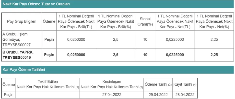 Yaprak Süt #YAPRK, KAP'a yaptığı açıklama ile 29 Nisan'da yatırımcılarına bay başına 0,0225000 TL (%2.25) temettü dağıtacağını duyurdu. Yapılan açıklamanın detayları;