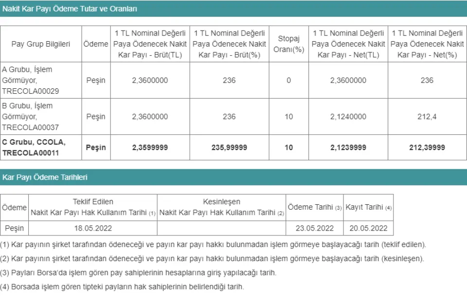 Borsa İstanbul'un dev şirketlerinden Coca Cola İçecek 2021 yılı faaliyet karından kar pay dağıtım kararı verdi Dağıtım oranın net %212 olduğu duyuruldu Kar payı almak isteyen yatırımcılar detaylar haberimizde..