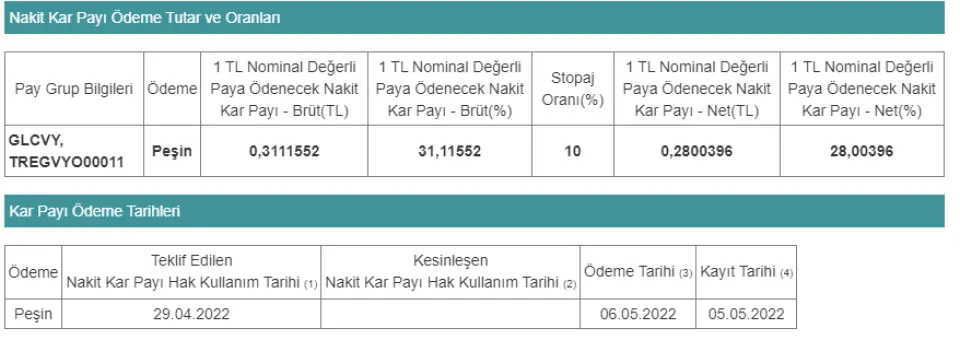 Şirketimizin 2021 yılı faaliyetleri sonucu, Sermaye Piyasası Kurulunun II-14.1 sayılı tebliğ hükümlerine uygun hazırlanan bağımsız denetimden geçmiş finansal tablolarında ve yasal kayıtlarında bulunan dağıtılabilir kârından karşılanmak üzere, Net Dönem Kârının yüzde 25'ine tekabül eden 43.468.395 TL tutarında temettünün aşağıda özeti yer alan ekteki kâr dağıtım tablosuna uygun olarak 29.04.2022 tarihinden itibaren nakit olarak dağıtılması hususlarının Genel Kurul'un onayına sunulmasına karar verilmiştir.