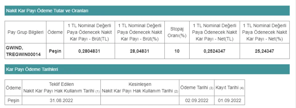Borsa İstanbul'da işlem gören hisselerden Gwind geçtiğimiz sene halka arz oldu. Halka arz olduğundan beri yatırımcılar tarafından çok konuşulan hisseler arasında yerini alıyor. Bilançosu gelen hissede brüt olarak 170 Milyonluk temettü kararı verdi. Temettü dağıtmak oranı nedir? Ne kadar temettü dağıtacak? Tüm detayları ile... Halka arz olan Hisseden rekor