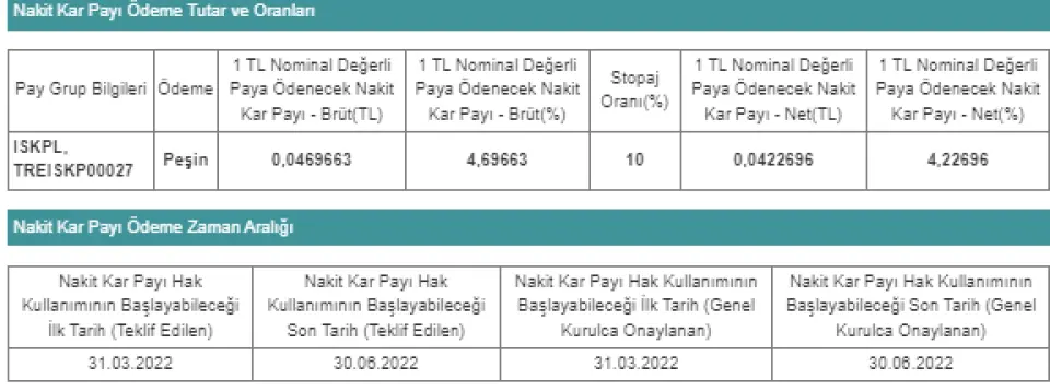 Şirket ortaklarımıza net dönem karından dağıtılmak üzere ayrılan birinci temettü tutarı, 2021 yılı karından herhangi bir istisnaya ve Gelir Vergisi Kanunu'nun Gecici 61.maddesi kapsammda yatırım indirimi istisnasına tabi olmayan kısmından brüt 10.000.000,00 TL tutarın ortaklara dağıtılması ve kar payı dağıtımının 30.06.2022 tarihine kadar yapılması, Olağan Genel Kurul Toplantısı'nda görüşülmüş ve kabul edilmiştir.