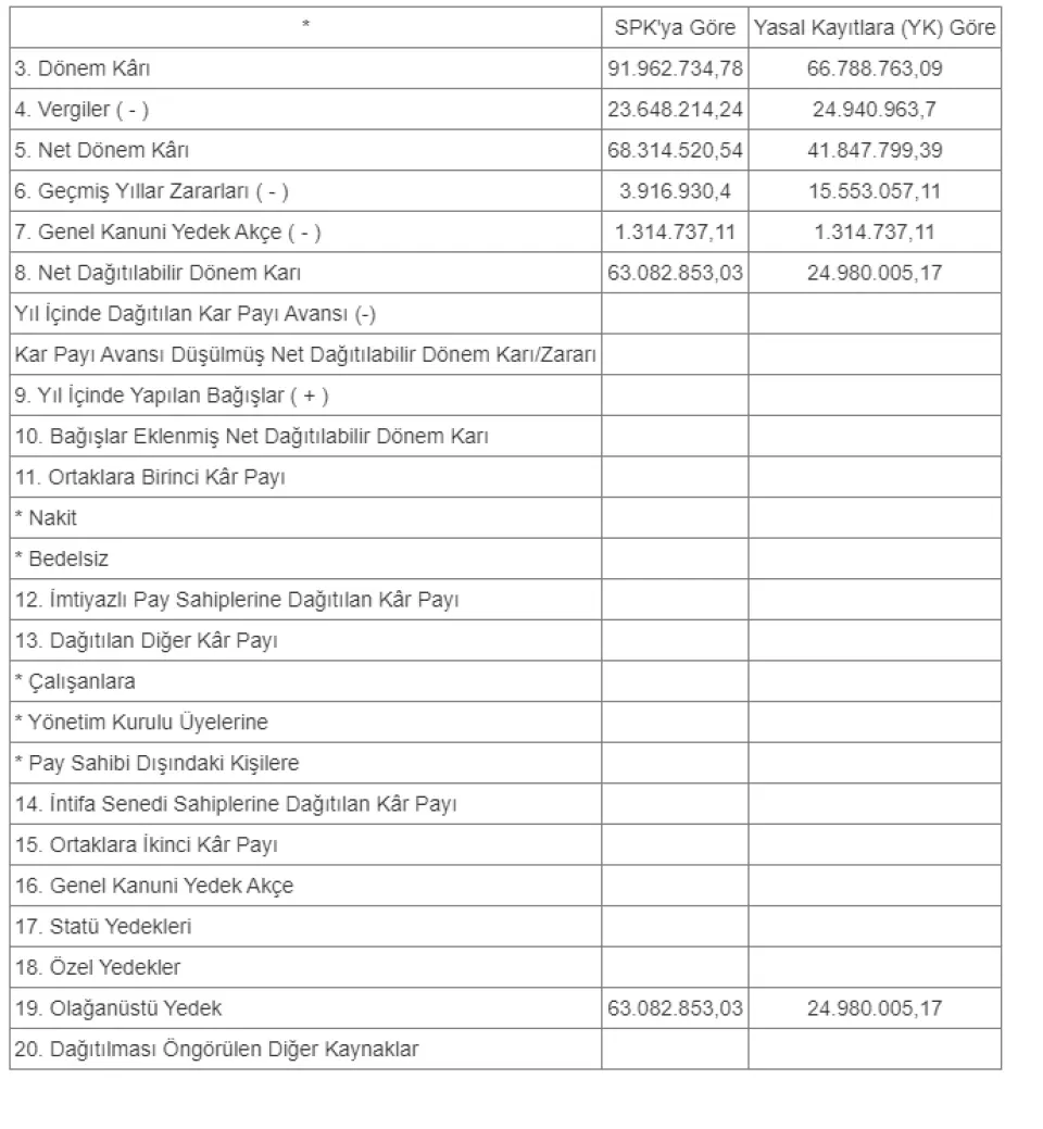 1-Sermaye Piyasası Kurulu'nun II-14.1 sayılı tebliği hükümleri uyarınca hazırlanıp bağımsız denetimden geçmiş olan; 2021 dönemi finansal tablolarımıza göre Net Dönem Kârı 68.314.520,54 TL olup, 3.916.930,40 TL geçmiş yıl zararları ve 1.314.737,11 TL Genel Kanuni Yedek Akçe düştükten sonra 63.082.853,03 TL Net Dağıtılabilir Dönem Kârına ulaşılmaktadır.