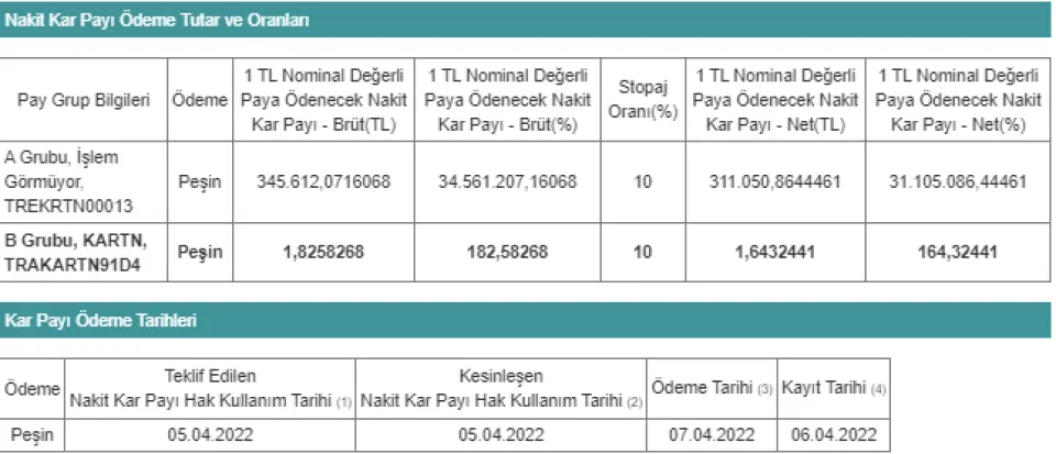 2-Şirketimiz sermayesini oluşturan pay senetlerinden İmtiyazlı Payların (A Grubu Payların) aynı zamanda İmtiyazlı olmayan paylara dağıtılan ( B grubu Paylar) kar payından da kar payı alma hakkı bulunmaktadır. İş bu bildirimde yer verilen pay başına brüt ve net kar payları, her bir pay grubunun alacağı toplam kar payı tutar ve oranlarını ifade etmektedir.