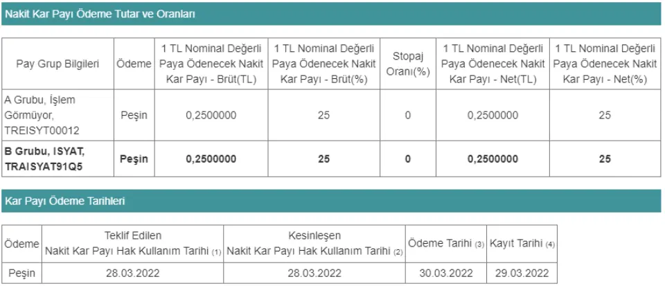Şirketimizin 01.01.2021 - 31.12.2021 dönemine ait, Sermaye Piyasası Kurulunun II-14.1 sayılı tebliğ hükümlerine uygun hazırlanan bağımsız denetimden geçmiş finansal tablolarında ve yasal kayıtlarında bulunan dağıtılabilir kârından, çıkarılmış sermayesinin % 25 (brüt=net) oranında, 40.149.821 TL tutarında temettünün ilişikte yer alan kâr dağıtım tablosuna uygun olarak, 28 Mart 2022 tarihinden itibaren nakit olarak dağıtılması hususu 22 Mart 2022 tarihinde yapılan 2021 yılı Olağan Genel Kurul toplantısında onaylanmıştır.