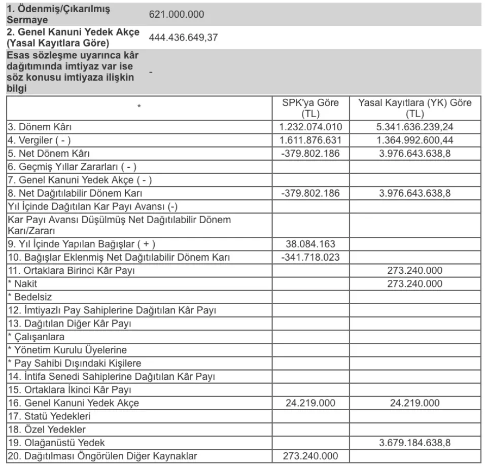 "Yönetim Kurulu tarafından, Şirketimizin 2025 hesap dönemine ilişkin finansal sonuçları, Türk Ticaret Kanunu hükümleri, kar dağıtım politikası ve işletme sermayesi ihtiyacı birlikte değerlendirilerek geçmiş yıl karlarından nakit kar payı dağıtılmasına, ayrılması gereken yasal yedekler sonrası bakiyenin olağanüstü yedeklere aktarılmasına ve kar dağıtımının 17.04.2026 tarihinden itibaren başlatılmasına ilişkin teklifin Genel Kurul'un onayına sunulmasına karar verilmiştir."